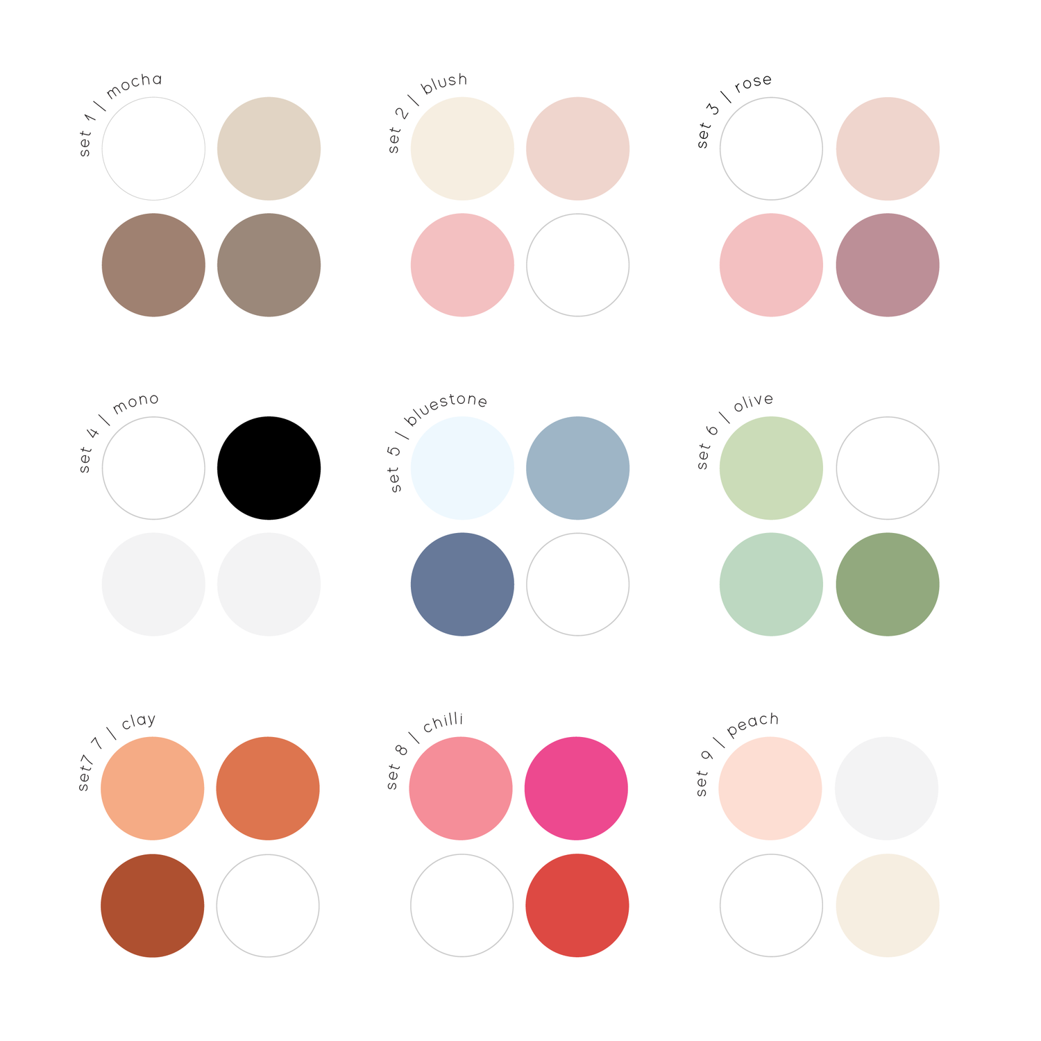 These are our most popular colour combinations for this coming season. Please use these palettes as a guide only and feel free to mix and match to suit your colour scheme.