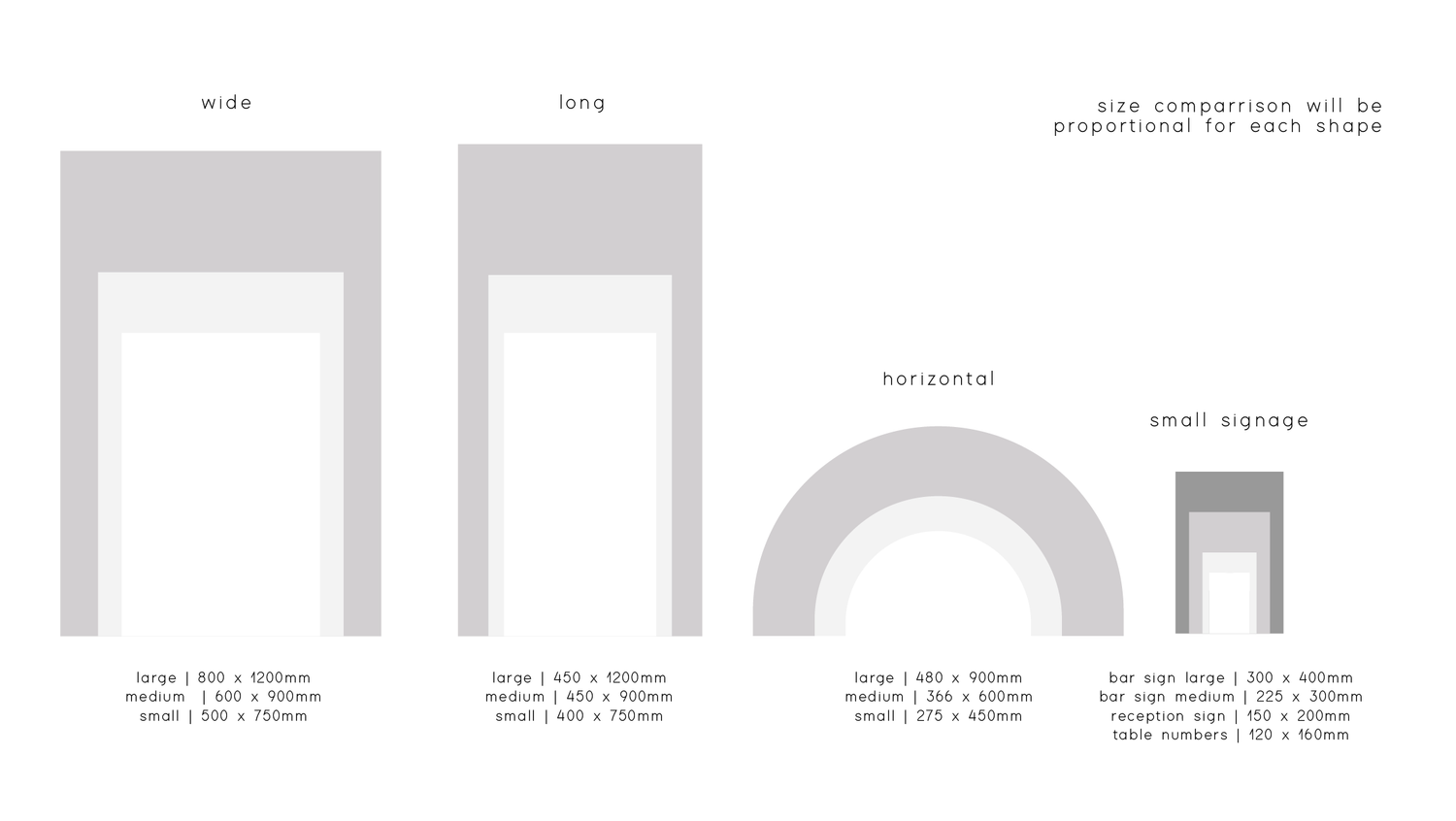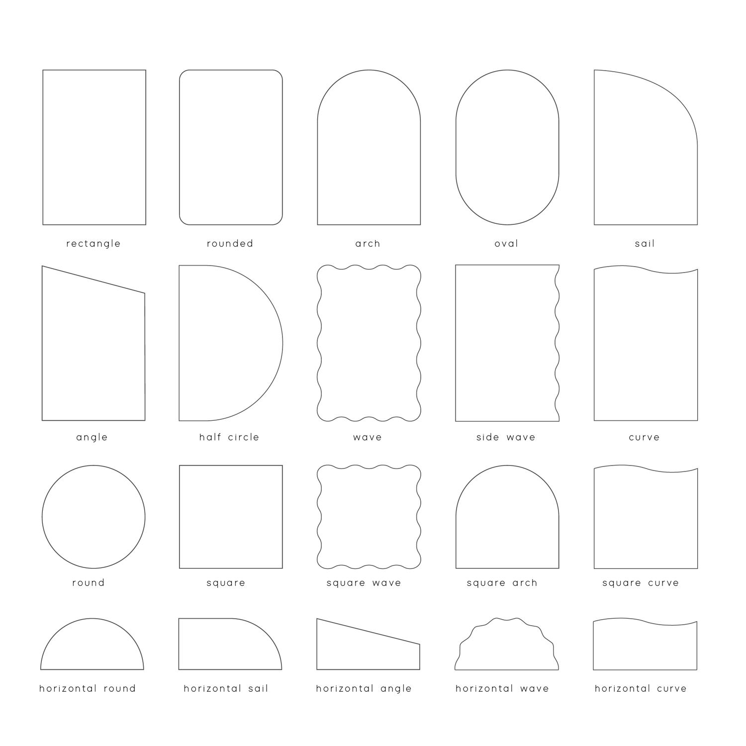 Featured are all of our different sizes and the comparisons between each. The rectangle and arch size comparison will be proportional for each shape, this is a guide only.